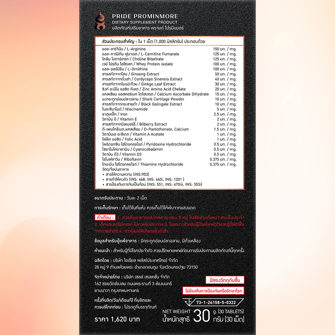 ส่วนผสม แอล-อาร์จินีน 150 มก แอล-คาร์นิทีน 125 มก โคลีน ไบทาร์เทรท 125 มก เวย์ โปรตีน ไอโซเลท 100 มก แอล-ออร์นิทีน 100 มก สารสกัดจากโสม 50 มก สารสกัดจากถังเซ่า 40 มก สารสกัดจากใบแป๊ะก๊วย 30 มก ซิงค์ อมิโน แอซิด คีเลต 20 มก แคลเซียม แอสคอร์เบท ไดไฮเดรต 15 มก ผงกระดูกอ่อนปลาฉลาม 10 มก สารสกัดจากกระชายดำ 10 มก ไนอะซินาไมด์ 5 มก ธาตุเหล็ก 2.5 มก วิตามินอี 2 มก สารสกัดจากบิลเบอร์รี่ 2 มก ดี-เพนโทธีเนต แคลเซียม 1.5 มก วิตามินเอ อะซิเตต 1 มก โฟลิค แอซิด 1 มก ไพริดอกชิน ไฮโดรคลอไรด์ 0.5 มก ไชยาโนโคบาลามิน 0.5 มก วิตามิน ดี3 0.5 มก ไรโบฟลาวิน 0.375 มก ไทอะมิน ไฮโดรคลอไรด์ 0.375 มก